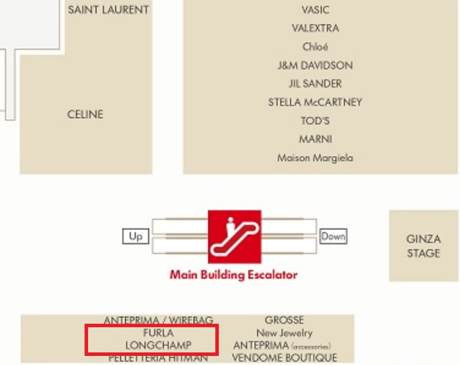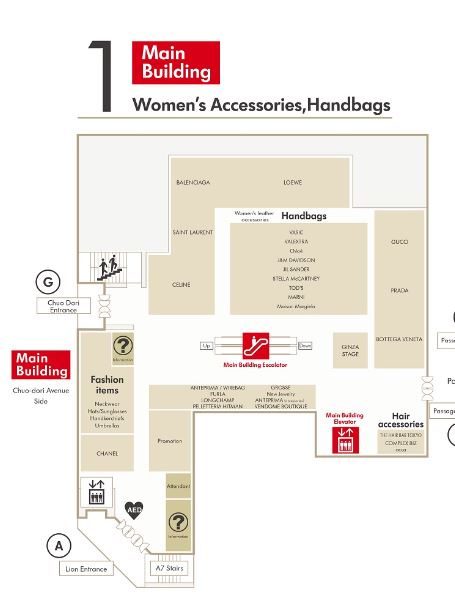 메인빌딩 중앙 에스컬레이터 기준 오른쪽에 위치하고 있어요. 특유의 가방들이 많이 전시되어 있기 때문에 찾는데 큰 어려움은 없으실거에요. 반드시 메인 빌딩으로 가셔야 한다는 점 잊지마세요!