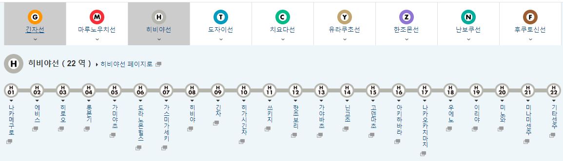 나카메구로에서 출발해서 기타센주까지 운행하는 히비야선은 조금 생소하실 수도 있지만 봄철 벚꽃놀이로 유명한 나카메구로, 에비스, 롯폰기, 긴자, 쓰키지 수산시장, 아키하바라, 우에노 등 유명한 관광명소를 지나다니고 있는 노선이에요.