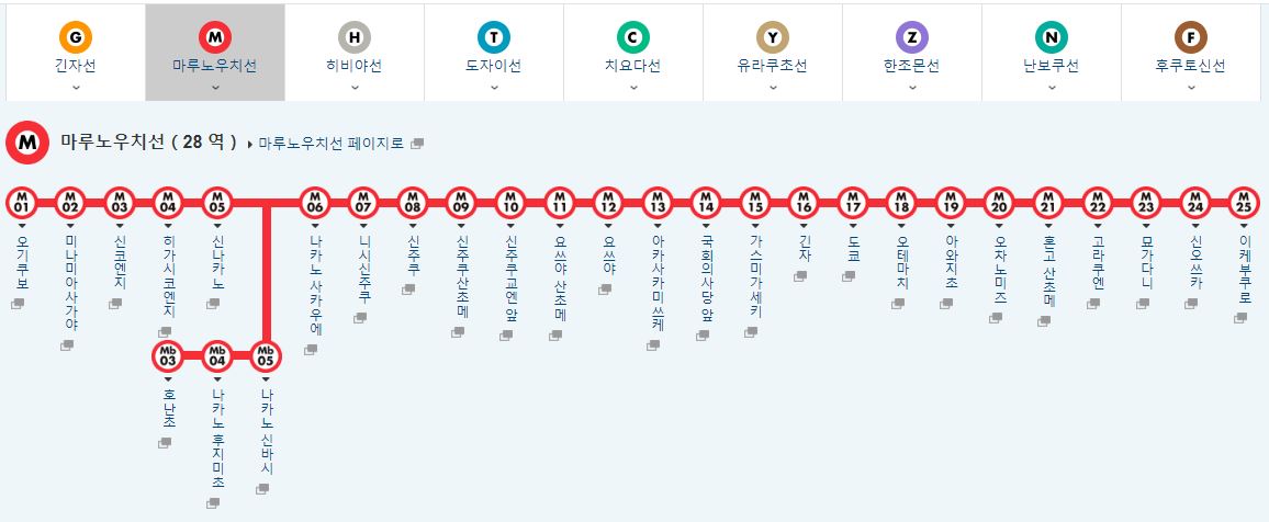 일본 사람들이 많이 살고 있는 동네에서 출발해서 신주쿠, 아사쿠사, 국회의사장, 긴자, 도쿄역, 고라쿠엔, 이케부쿠로까지 이어지는 지하철이에요. 정작 JR을 이용하면 신주쿠에서 이케부쿠로까지는 5정거장 정도이지만 마루노우치선은 여기저기 지나다니기 때문에 상당히 오래걸려요. 이런 경우에는 돈을 내고 JR 야마노테선을 이용하시는 것도 좋아요