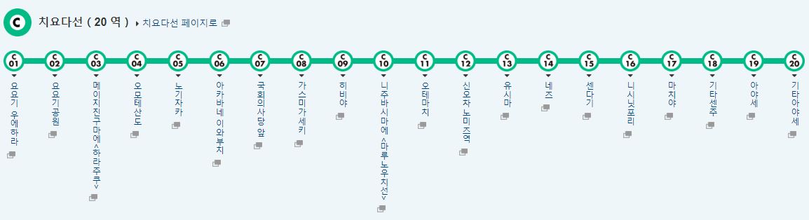 치요다선은 중간에 도쿄를 벗어나는 다른 노선과 이어지는 경우가 있어 도쿄를 벗어날 경우, 추가 비용을 지불해야 하니 주의해야해요. 유명한 장소로는 요요기 공원, 메이지신궁, 오모테산도 정도가 있어요. 한 가지 팁으로는 JR 하라주쿠역을 가고 싶은 분들은 3번 메이지진구마에 또는 4번 오모테산도 역에서 내리면 하라주쿠를 가실 수 있어요. 이름만 다르지 하라주쿠에요.