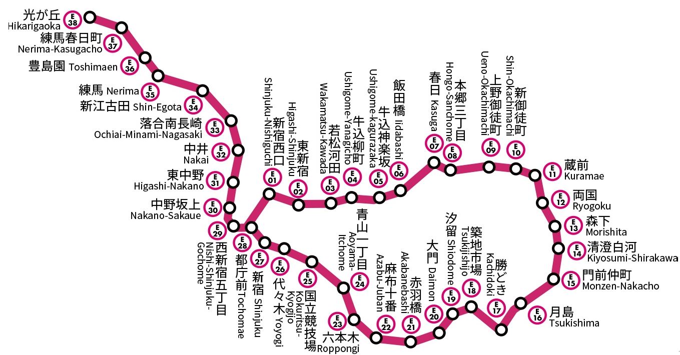 도쿄메트로와 다른 도에이 노선이에요. 자주색으로 표시된 이 노선은 상당히 많은 관광지를 구경할 수 있어요. 어려울 수 있지만 동그라미 안에 적혀있는 번호로 기억해두면 기억하기 쉬워요. 주요 역으로는 28번 도쿄 도청앞, 27번 신주쿠, 23번 롯본기, 19번 시오도메, 18번 츠키지 시장 정도가 있겠네요.