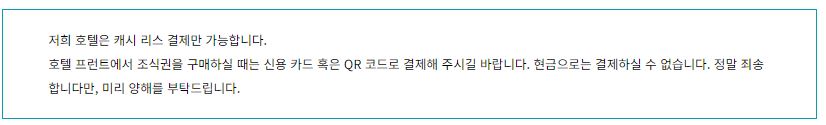 혹시라도 조식을 이용하시는 분이 계실까봐 아래 유의사항 안내드려요. 조식 운영 시간, 현금 결제가 불가하다는 점 꼭 알아두세요!