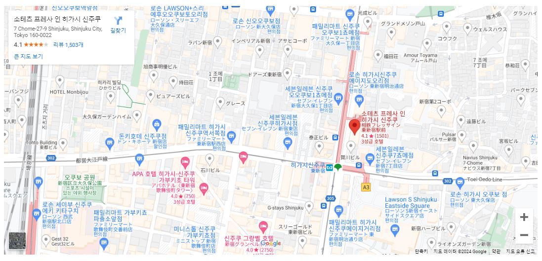 '소테츠 프레사 인 히가시 신주쿠'는 가성비가 좋기로 알려진 호텔이에요. 학생일 때부터 직장인이 된 지금까지 눈여겨 보면서 상대적으로 저렴한 가격에 좋은 컨디션이라고 생각하고 이용하고 있어요. 역과 가깝다는 장점부터 돈키호테, 백화점 등 단점이 크게 없다고 생각하는 좋은 호텔이기에 가격이 좀 저렴하지만 컨디션이 좋고 교통까지 편리한 호텔을 이용하고 싶다면 '소테츠 프레사 인 히가시 신주쿠' 괜찮다고 생각해요.