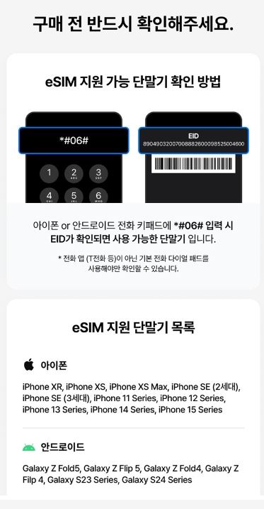 그리고 가장 중요한 내용은 eSIM 사용 가능한 핸드폰 기종이 따로 있다는 점입니다