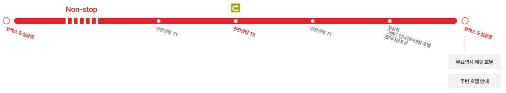 코엑스 도심공항에서 출발해서 멈추지 않고 직통으로 인천공항 T1, 인천공항 T2에 도착하고 이어서 삼성역, 코엑스 도심공항으로 돌아오는 노선이에요.